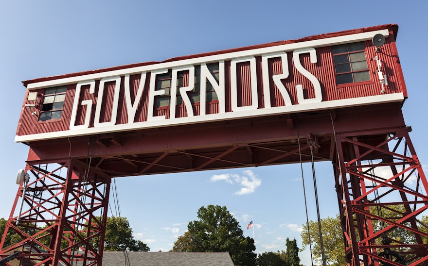 The trellis-like signage at Governors Island is inspired by the gantries at its docks.