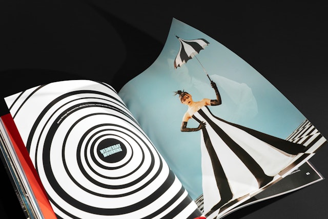 While a few elements remain constant across issues — the cover treatment, a front-of-book section featuring full-bleed imagery, a back-of-book section of repeatable columns, and a standing set of five typefaces — the design styles and color palettes change regularly. Issue 5, for example, features a bold neon green throughline, and a series-focused Issue 8 employs television color bars on the page edges. Special sections incorporate distinctive iconography, typefaces, and colors to embody the section’s theme: documentary, animation, LGBTQIA+ talent, global storytelling. World-class photographers (including Inez & Vinoodh and Ryan McGinley) and illustrators (such as Shyama Golden, Paulina Almira, and Barry Falls) have contributed original work to its pages. Standalone special issues, including a zine geared toward a young-adult audience, embrace their own unique aesthetics.