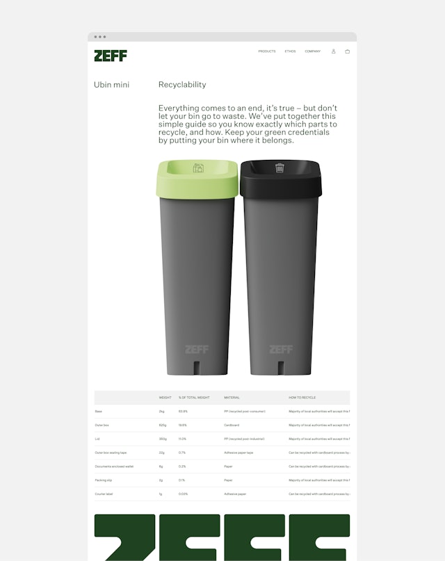 Reflecting Zeff’s detail-orientated ethos, the identity makes the process and information behind Zeff products clear and accessible, using a technical, engineered visual language to communicate Zeff’s design expertise and sustainability benefits. From the diagrams describing the bin’s features, to the motion-led product renders that reflect the brand’s precision, to the bespoke icons that illustrate different waste streams and sustainable practices, all elements double down on Zeff’s exacting approach. Similarly, Zeff’s bespoke, bold workmark reflects the brand’s product heritage with reference to the Ubin’s signature curves, whilst allowing space for future innovations.