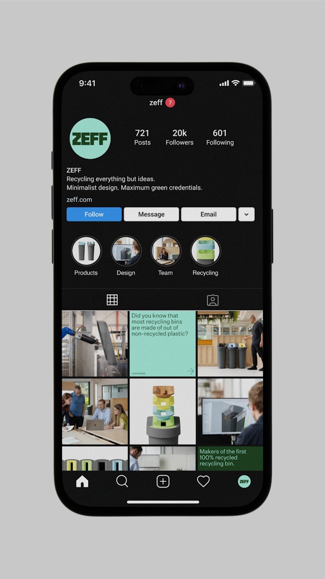 The brand identity subsequently influenced the product itself, with the introduction of a new set of Zeff waste stream colours that would sit as comfortably in an office or at home, as well as the introduction of the logo to the bin itself. Ultimately, our core concept ‘technical and transparent’ allows the brand to straddle both B2B and a future B2C audience, deftly balancing rigour with openness.