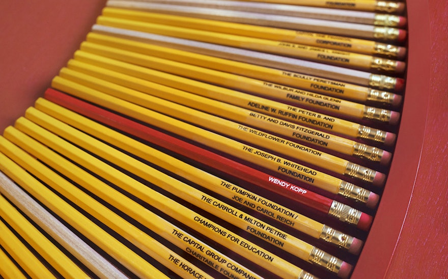 The 240 yellow, red, and natural-colored pencils are individually stamped with the names of donors.